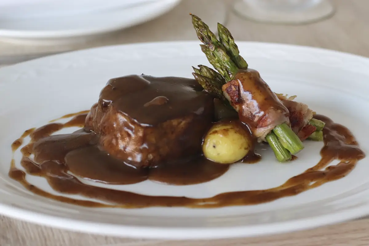 Solomillo de ternera con crema de foie, peras caramelizadas al vino tinto con salsa perigord