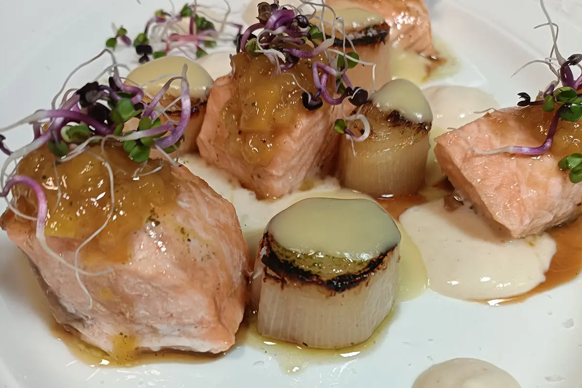 Rodaballo con salsa Bilbaína, trigueros con salsa Romesco