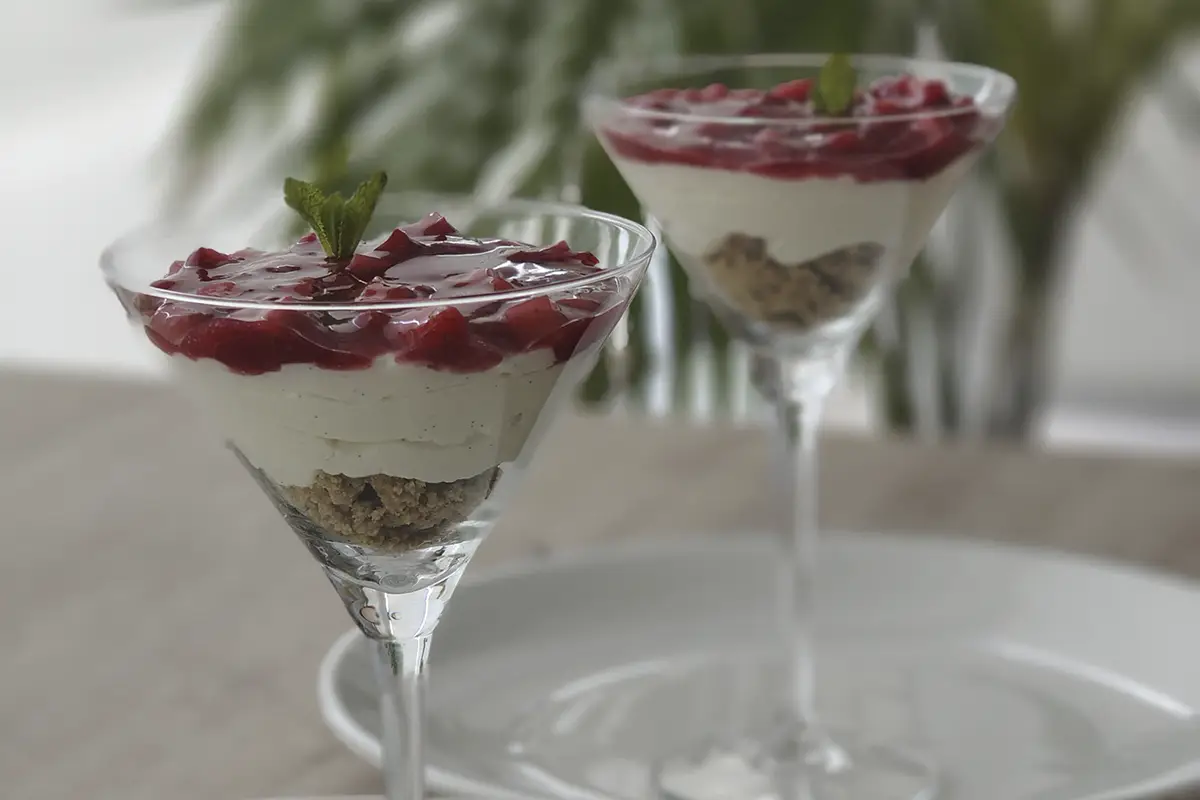 Mousse de chocolate blanco con crumble de pistacho y confitura de fresas
